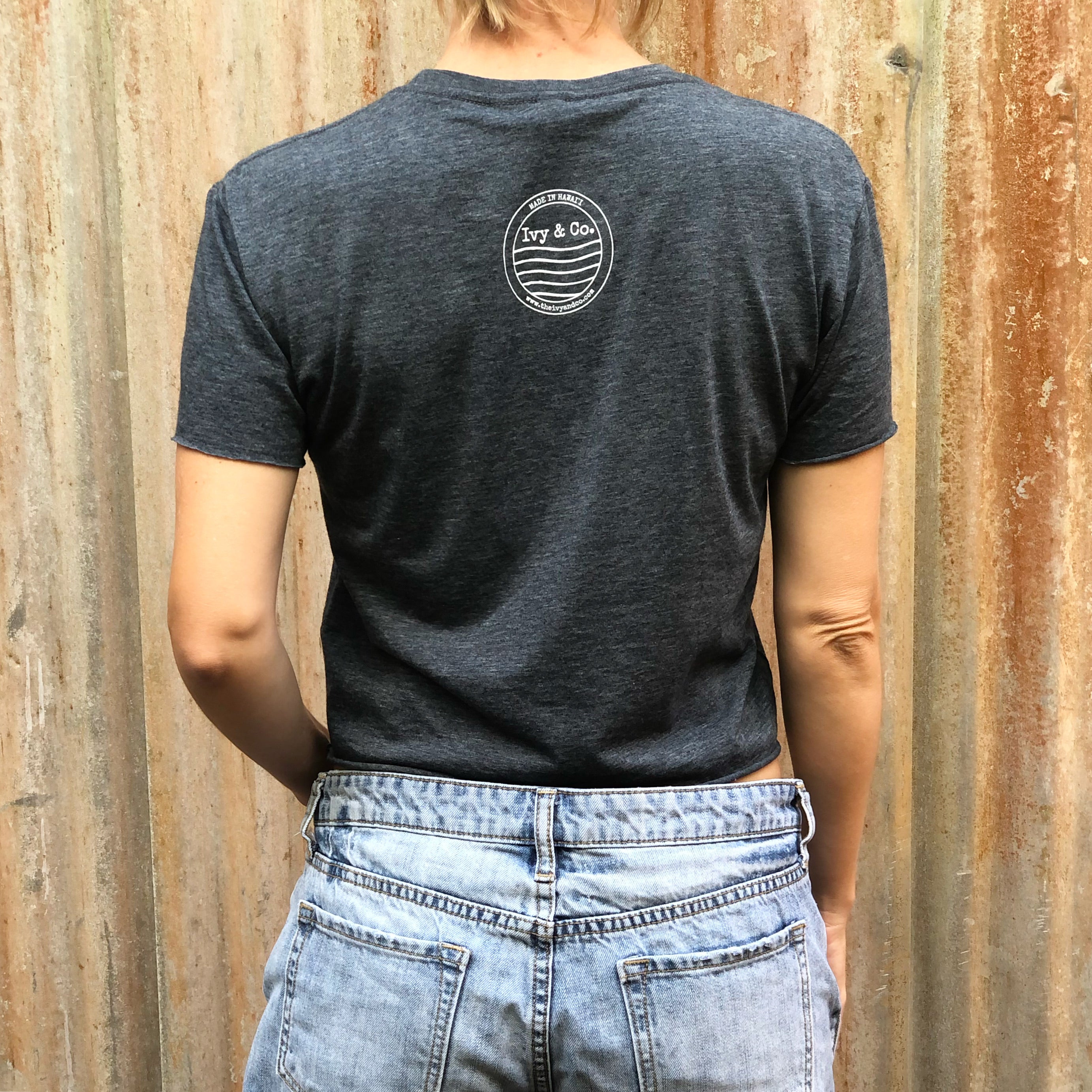 White ink. The Ivy & Co. logo is printed on the upper back of the tee. Logo style may vary.